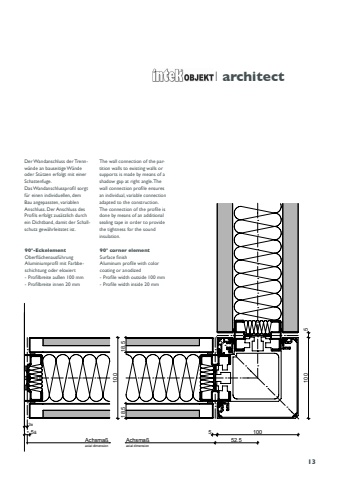 3%u00b15%u00b1 5 100100552.5100Achsma%u00df Achsma%u00df 18.5 18.5axial dimension axial dimension l architect13Der Wandanschluss der Trennw%u00e4nde an bauseitige W%u00e4nde oder St%u00fctzen erfolgt mit einer Schattenfuge.Das Wandanschlussprofil sorgt f%u00fcr einen individuellen, dem Bau angepassten, variablen Anschluss. Der Anschluss des Profils erfolgt zus%u00e4tzlich durch ein Dichtband, damit der Schallschutz gew%u00e4hrleitstet ist.The wall connection of the partition walls to existing walls or supports is made by means of a shadow gap at right angle. The wall connection profile ensures an individual, variable connectionadapted to the construction. The connection of the profile is done by means of an additional sealing tape in order to provide the tightness for the sound insulation.90%u00b0-EckelementOberfl%u00e4chenausf%u00fchrung Aluminiumprofil mit Farbbeschichtung oder eloxiert- Profilbreite au%u00dfen 100 mm- Profilbreite innen 20 mm 90%u00b0 corner elementSurface finishAluminum profile with color coating or anodized- Profile width outside 100 mm- Profile width inside 20 mm