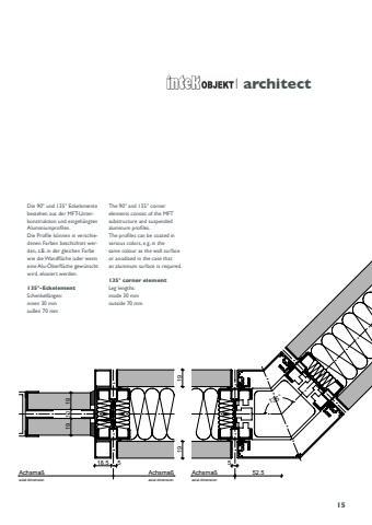 Achsma%u00df18.5 519 10 1952.5519 19Achsma%u00df Achsma%u00df135%u00b0axial dimension axial dimension axial dimension l architect15Die 90%u00b0 und 135%u00b0 Eckelemente bestehen aus der MFT-Unterkonstruktion und eingeh%u00e4ngten Aluminiumprofilen. Die Profile k%u00f6nnen in verschiedenen Farben beschichtet werden, z.B. in der gleichen Farbe wie die Wandfl%u00e4che oder wenn eine Alu-%u00d6berfl%u00e4che gew%u00fcnscht wird, eloxiert werden.135%u00b0-EckelementSchenkell%u00e4ngen:innen 30 mm au%u00dfen 70 mmThe 90%u00b0 and 135%u00b0 corner elements consist of the MFT substructure and suspended aluminum profiles.The profiles can be coated in various colors, e.g. in the same colour as the wall surface or anodized in the case that an aluminum surface is required.135%u00b0 corner elementLeg lengths:inside 30 mmoutside 70 mm