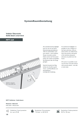MFT Vollt%u00fcren l Solid doorsMaterial l MaterialHolz, Stahl l Wood, steel Schallschutz l Sound protection Brandschutz l Fire protection Rauchschutz l Smoke protection bis l up to 47 dB T 30 oder l or EI2 30 C0 RS-T%u00fcr l RS door SystemRaumGestaltung18Als architektonisches Highlight kann f%u00fcr die mit der Wand fl%u00e4chenb%u00fcndig abschlie%u00dfende 100 mm starke Vollt%u00fcr noch eine weitere - nicht sichtbare Zarge verwendet werden. Dabei werden die Trennwandplatten der seitlich anschlie%u00dfenden Elemente %u00fcber die Zarge gezogen.Nat%u00fcrlich besteht die M%u00f6glichkeit der Ausf%u00fchrung der T%u00fcren- und Wandfl%u00e4chen mit Akustikplatten -einseitig oder beidseitig.As architectural highlight it is possible to use in addition to the flush solid door, 100 mm thick, further not visible frame. Here the partition wall panels of the laterally subsequent elements are pulled over the frame. Of course it is possible to execute the door and wall surfaces with acoustic panels %u2013 one side or both sides.MFT Voll - Doppelt%u00fcrMFT solid double doorVollt%u00fcr %u00dcbersichtSolid doors overviewMFT wall